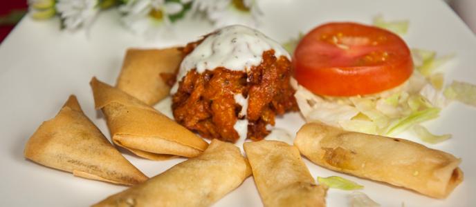 | Selection of vegetarian samosa, onion bhajeeand spring rolls. | ||||
